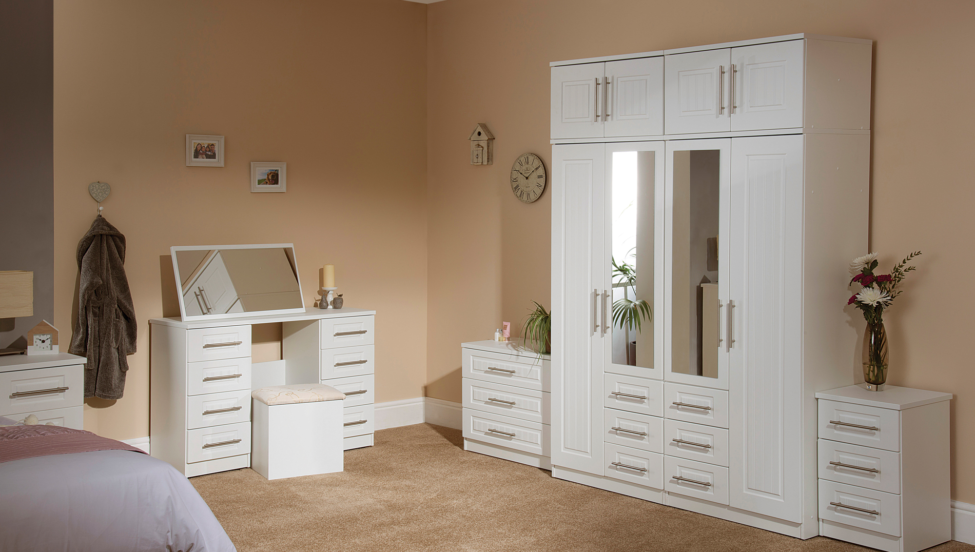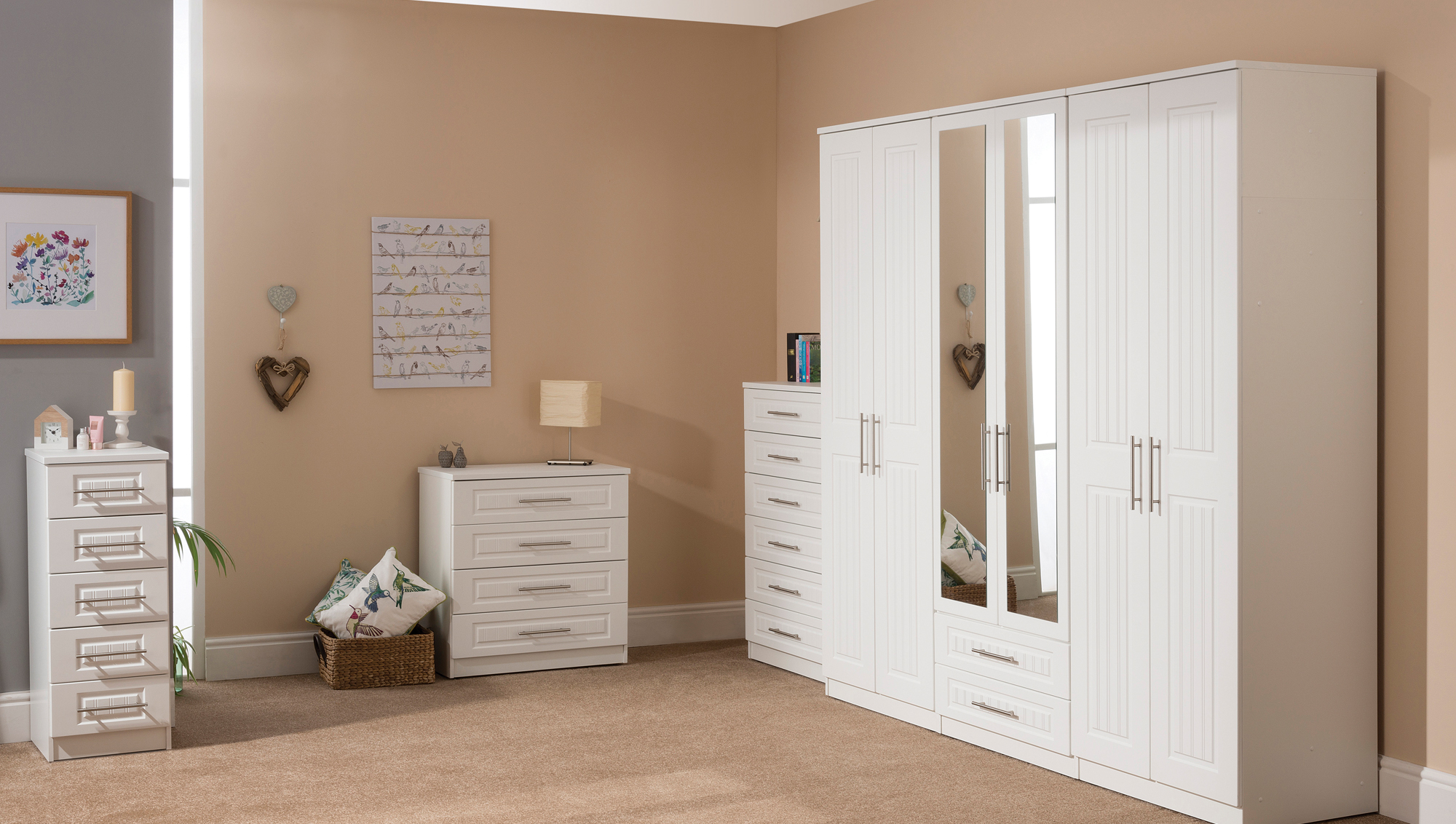 The beautifully bevelled finish of Newport White takes its lead from tradition and is inspired by purity. The frames and fronts are finished with the same soft touch texture in white and are complemented by brushed steel finish straight bar handles that are fitted as standard.